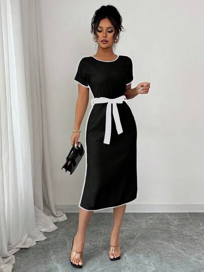 Rafferiza 圆领短袖T恤连衣裙,系腰,修身通勤连衣裙 - 黑色 - 查看 1