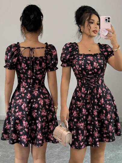 Rafferiza 女士碎花方领泡泡袖荷叶边腰部抽绳连衣裙 - 彩色 - 查看 1