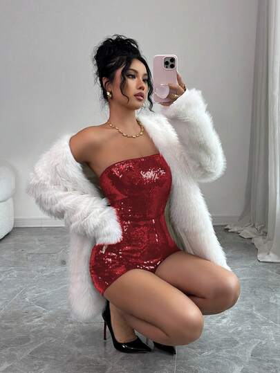 Rafferiza 女士时尚性感别致派对纯色亮片紧身连体衣 - 紅色 - 查看 1