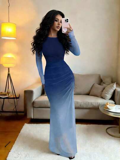 Rafferiza 女士透视网纱长袖渐变褶皱修身连衣裙,休闲日常沙滩装、居家服、办公服 - 藏蓝色 - 查看 1
