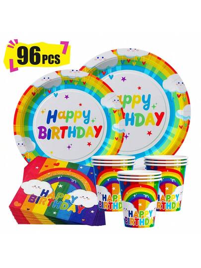 彩虹生日快乐一次性餐盘、餐巾纸和杯子,派对用品套装,可供 24 人使用,一次性纸质派对餐具,适用于生日、婚礼、主题派对、家庭野餐。