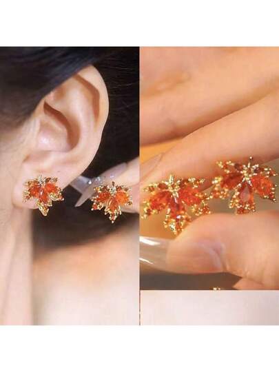 女士红枫叶耳钉,独特设计时尚秋冬叶形耳环,轻巧奢华百搭配饰 - 金黃色 - 查看 1