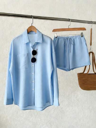 Resyla 女士休闲度假风宽松蓝色条纹长袖衬衫,配有抽绳腰带和蝴蝶结,以及配套蓝色休闲度假风短裤,两件套 - 藍色 - 查看 1