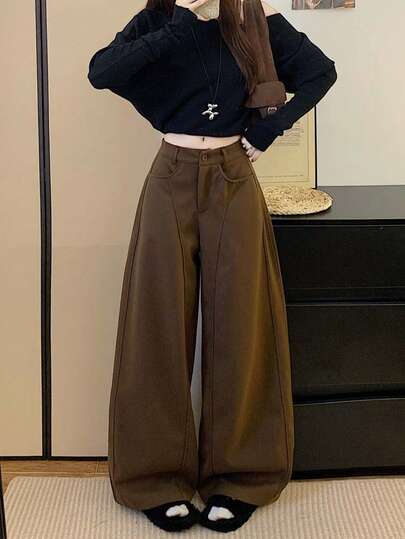 复古美式休闲羊毛直筒宽松阔腿裤,秋冬季百搭单品 - 咖色 - 查看 1
