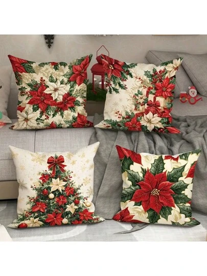 复古圣诞一品红抱枕套,农舍圣诞树方形枕套,圣诞花卉装饰,沙发客厅床用节日装饰 - 彩色 - 查看 10