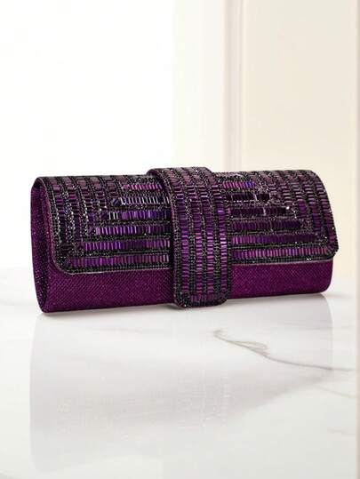 镶钻女士晚宴包,小信封式手提包,缎面肩链手提包,亮紫色鸡尾酒包 - 紫色 - 查看 1
