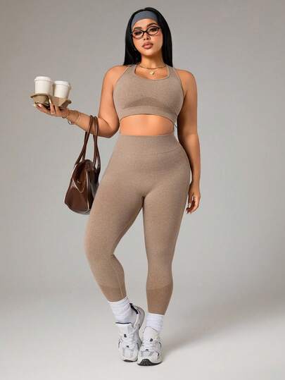 Rhythm Era 一套卡其色无缝加大码运动服套装,包括露背短款上衣和七分紧身裤,柔软舒适,适合健身、跑步、休闲和瑜伽。 - 卡其色 - 查看 1