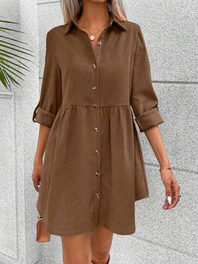 SHEIN LUNE 捲邊袖前紐扣襯衫洋裝 - 棕色 - 查看 1