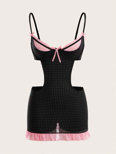 Sweetina 玫瑰粉色圆点网眼拼布蝴蝶结装饰高腰镂空荷叶边修身连衣裙 - 黑色 - 查看 1