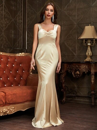 MUXXN 前收褶魚尾裙下擺緞面正式洋裝 - 香檳色 - 查看 1