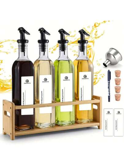 SAEIV Vinegar And Oil Bottle Set (4 X 500 Ml) With Warm Yellow Bamboo Rack, Oil Bottle With Pourer, Oil Dispenser With Label, Oil Pourer, Funnel, Pen, Helps To Organize Kitchen Oil And Vinegar Dispensers Neatly - 4個500ml油瓶帶架 - 查看 4