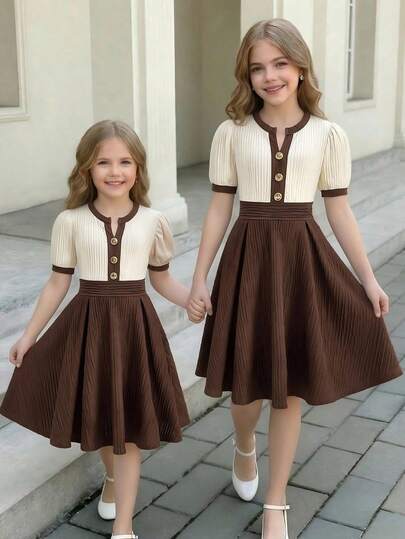 SHEIN 一件式女童秋冬优雅针织提花小V领连衣裙,金属扣装饰,拼接下摆,褶裥撞色设计,大码连衣裙,短袖修身连衣裙,适合日常外出、休闲聚会和各种场合。