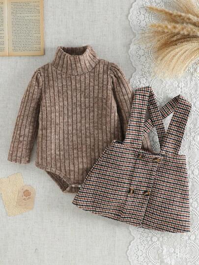 SHEIN 2件套女婴保暖可爱磨毛罗纹高领连体衣和格子背带A字裙套装,适合外出、度假、聚会和各种场合。 - 棕色 - 查看 1