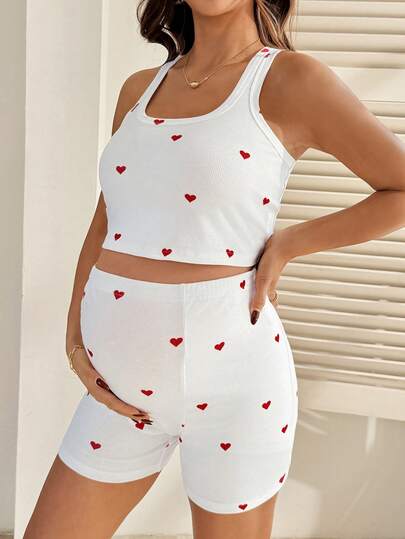 SHEIN 2件套孕妇爱心印花露脐背心和短裤套装,休闲款 - 白色 - 查看 1