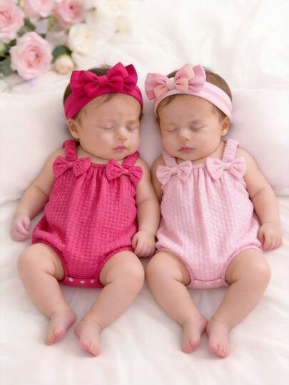 SHEIN 2件套女婴休闲优雅可爱3D立体花卉刺绣吊带连体衣,春夏款 - 粉色 - 查看 1