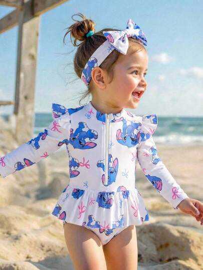 SHEIN 女婴可爱蝴蝶结兔子和大象印花发带(2件套);女婴荷叶边袖泳衣;女婴拉链泳衣;女婴长袖泳衣;女婴防晒泳衣;幼儿女童长袖泳衣;幼儿防晒泳衣;女童可爱动物印花泳衣;幼儿夏季套装;亲子泳装 - 藍色 - 查看 1