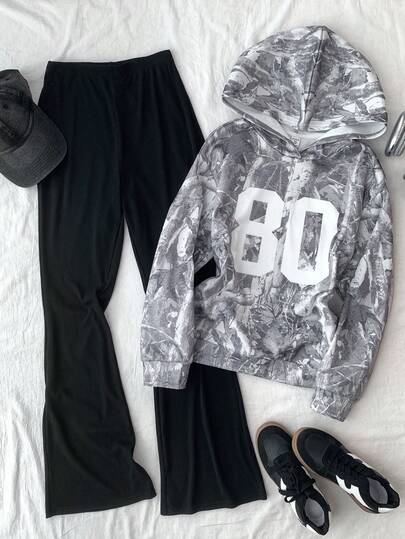 SHEIN 2 件套青少年女孩树叶印花休闲宽松长袖连帽衫和喇叭裤,运动时尚 - 彩色 - 查看 10