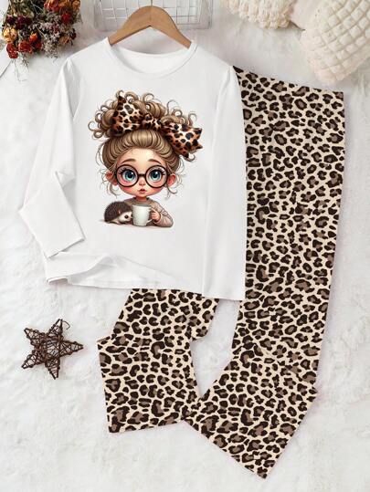 SHEIN 2 件套青少年女孩豹纹白色女孩图案休闲圆领长袖上衣和裤子家居服套装 - 白色 - 查看 2