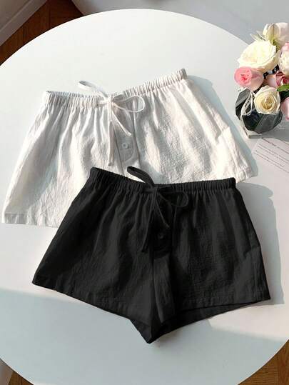 SHEIN 2条装少女轻薄宽松纹理梭织短裤,黑白配色,买一送一,春夏款 - 黑與白 - 查看 2