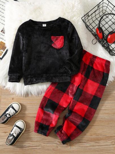 SHEIN 2 件装年轻男孩休闲格子图案口袋圆领长袖睡衣套装和格子睡裤,柔软舒适法兰绒服装,适合秋冬季 - 黑色 - 查看 1