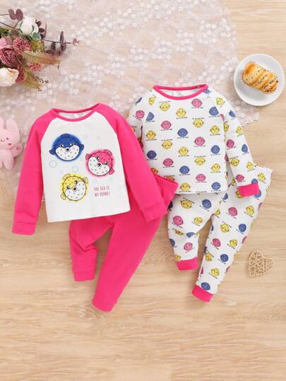SHEIN 4入組嬰兒女孩貼身套裝,可愛卡通圖案休閒套裝包括套頭拼接長袖t卹和長褲 - 玫紅色 - 查看 4