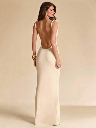 SHEIN BAE 杏色露背无袖修身连衣裙,针织连衣裙,优雅女士长裙,适合度假、海滩、郊游、春夏穿着
