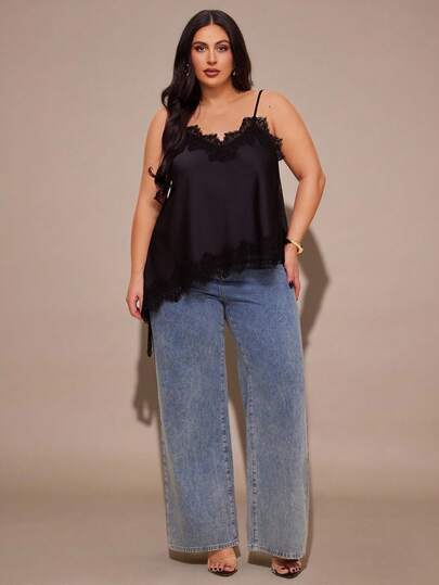 SHEIN BAE 大码女士蕾丝缎面衬衫,适合约会和派对穿着 - 黑色 - 查看 1