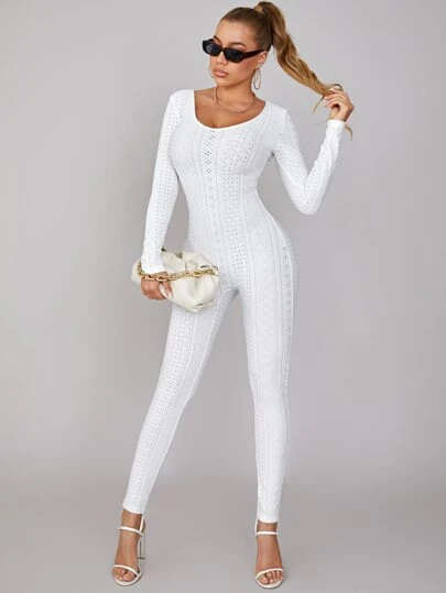 SHEIN BAE 大圓領網眼針織彈力緊身連體褲 - 白色 - 查看 1