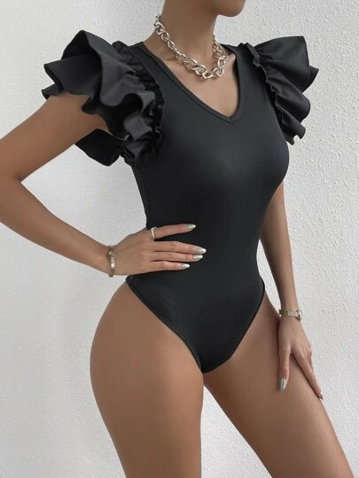 SHEIN BAE 素色螺紋針織蛋糕袖連體衣 - 黑色 - 查看 1