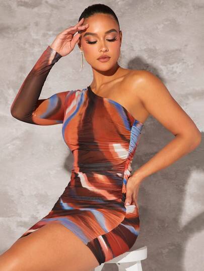 Silquee 紮染單肩褶邊緊身洋裝 - 彩色 - 查看 1