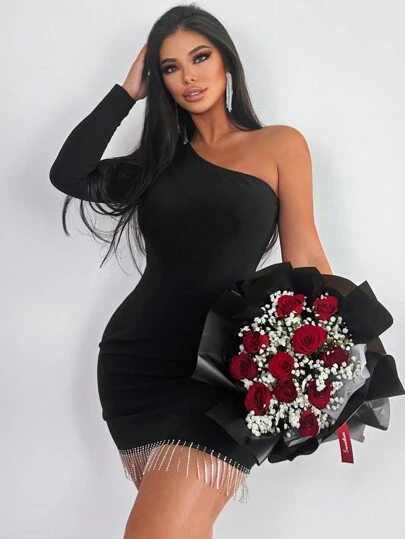 SHEIN Unity 女性一字肩長袖緊身連衣裙 - 黑色 - 查看 1