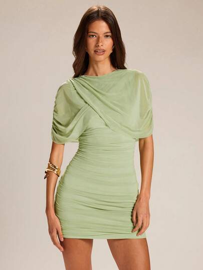 SHEIN BAE 女士纯绿色圆领不对称褶皱修身迷你连衣裙,适合度假、派对、音乐节、宴会、婚礼、毕业季、春夏等场合。 - 綠色 - 查看 6