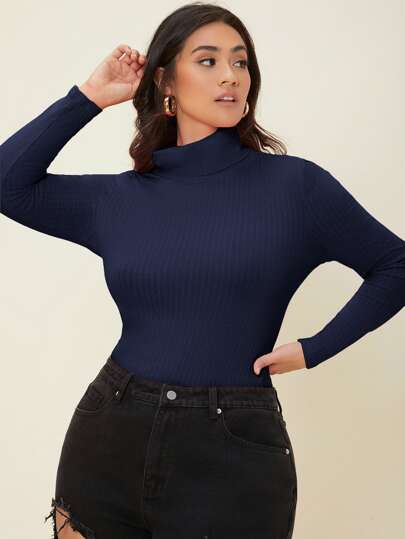 SHEIN BASICS 加羅紋針織高領 T 卹 - 藏蓝色 - 查看 1