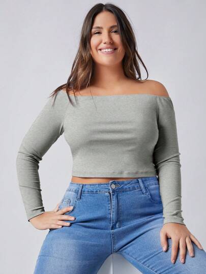 SHEIN BASICS 女款純色露肩長袖 T 卹 - 灰色 - 查看 1
