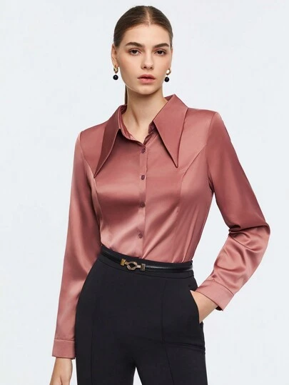 BizChic 純色正面鈕扣緞面襯衫 - 藕粉色 - 查看 1