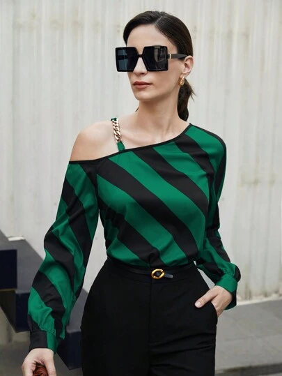 BizChic 条纹印花不对称颈部链条细节衬衫长袖图案衬衫 - 彩色 - 查看 1