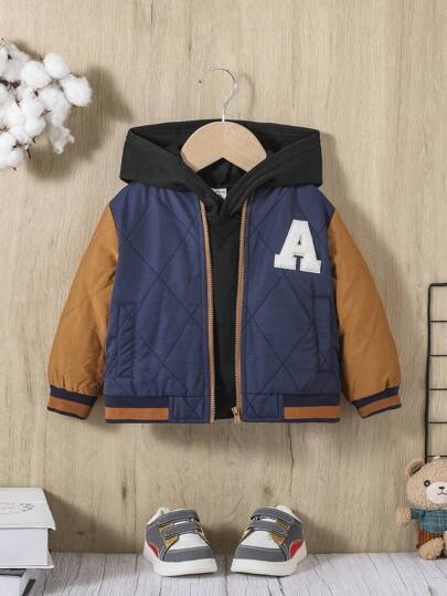 SHEIN 男婴单件字母拼贴条纹饰边拼色拉链连帽绗缝加厚外套 - 彩色 - 查看 1
