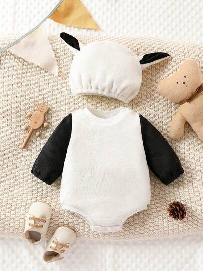 SHEIN 男嬰雙色3D耳朵設計連身背心&帽 - 彩色 - 查看 1