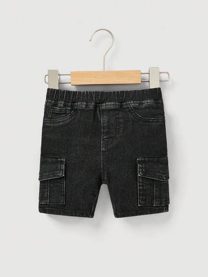 SHEIN 男婴春夏水洗翻盖口袋侧松紧腰工装牛仔短裤,男婴夏季下装套装 - 黑色 - 查看 1