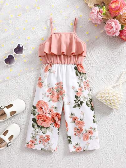 SHEIN 女婴可爱花卉印花无袖连体裤,夏季 - 粉色 - 查看 1