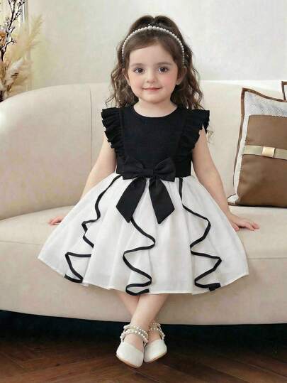 SHEIN 女婴时尚优雅连衣裙,圆领荷叶袖,波浪前摆,迷人风格,适合派对、休闲、送礼,春夏皆宜 - 彩色 - 查看 6