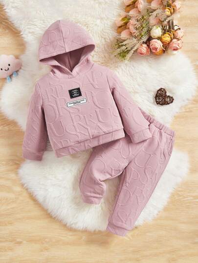 SHEIN 女嬰字母補丁細節連帽衫和運動褲 - 藕粉色 - 查看 1