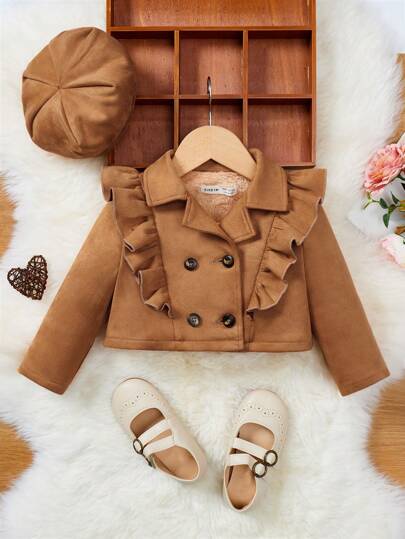 SHEIN 女嬰荷葉邊雙排釦夾克和帽 - 棕色 - 查看 1