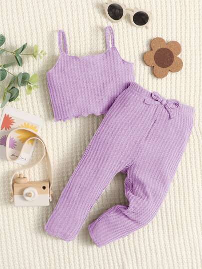 SHEIN 嬰兒女孩窩紋針織萊蕾邊背心上衣和蝴蝶結前裝褲 - 紫丁香色 - 查看 1