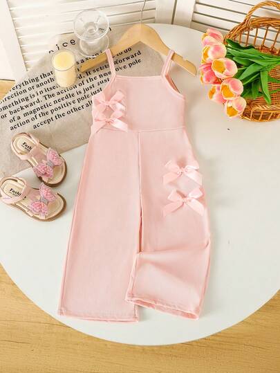 SHEIN 女婴甜美针织罗纹吊带连体衣,带蝴蝶结,适合度假和休闲外出,夏季 - 粉色 - 查看 1