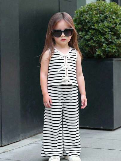 SHEIN 女婴可爱休闲撞色条纹蝴蝶结装饰背心和裤子套装 - 彩色 - 查看 1
