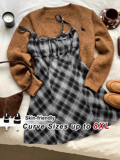 SHEIN CURVE+ 大码休闲复古蓝棕色格子背带连衣裙,可调节肩带,适合叠穿 - 黑與白 - 查看 5