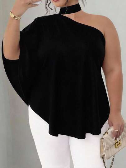 SHEIN CURVE+ 大码优雅纯色不对称领衬衫,夏季 - 黑色 - 查看 1