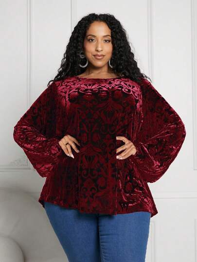 SHEIN CURVE+ 大尺碼提花編織燈籠袖 T 卹 - 酒紅色 - 查看 1