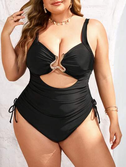 SHEIN CURVE+ 大码女士黑色纯色金色装饰连体泳衣,适合海滩度假 - 黑色 - 查看 1